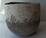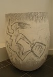 2019pot beschilderd met witte engobe waarin vrouwfiguren gekrast zijn.